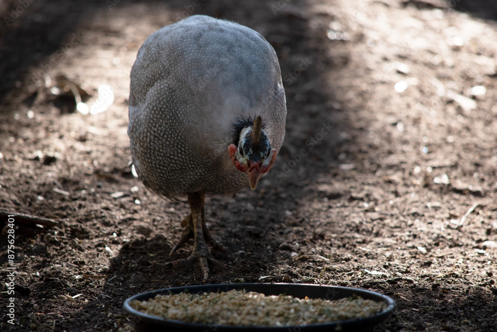 The Helmeted Guinea fowl is gray-black speckled with white.
