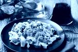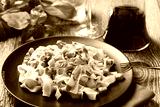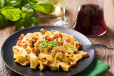 Pasta Carbonara with bacon, basil and cheese