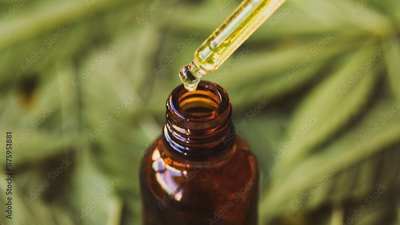 Drop of hemp based pharmaceutical CBD oil with blur background of cannabis marijuana leaves
