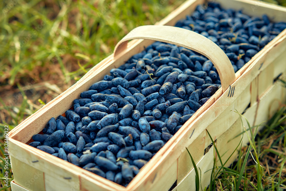 Fresh blue honeysuckle berries in a basket are perfect for a summer snack or cooking