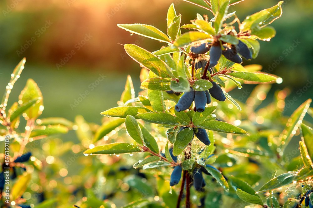 Ripe blue honeysuckle berries on a bush in a sunny garden, forming a colorful and vivid scene