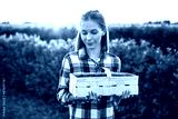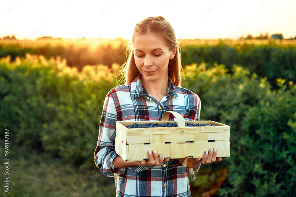 A woman is enjoying a peaceful moment picking ripe blue honeysuckle berries in the countryside during sunset