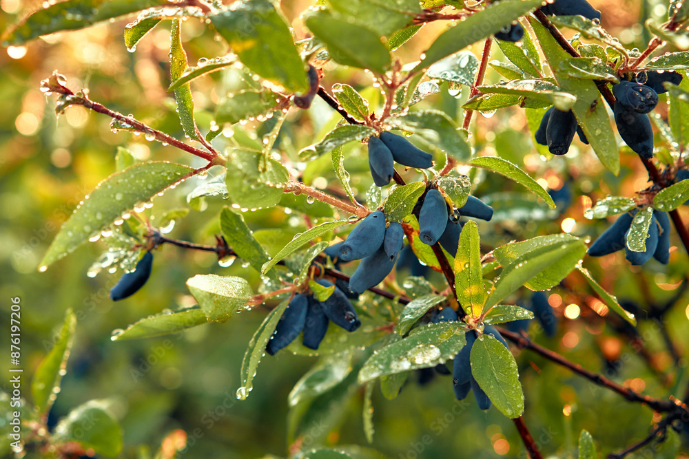 Ripe blue honeysuckle berries on a bush in a sunny garden, forming a colorful and vivid scene