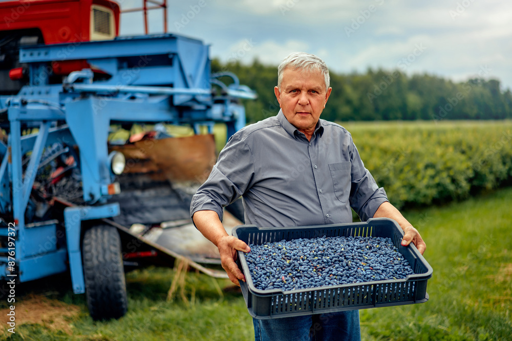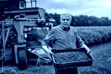 A farmer holding freshly harvested blueberries on a blue machine in an agricultural setting