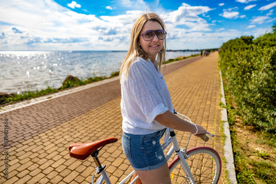 Summer vacation by bike. Young woman with long hair wearing white shirt and denim shorts standing with white and red fixed gear bike on bicycle path on seafront on sunny day. Portrait