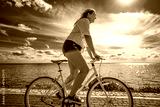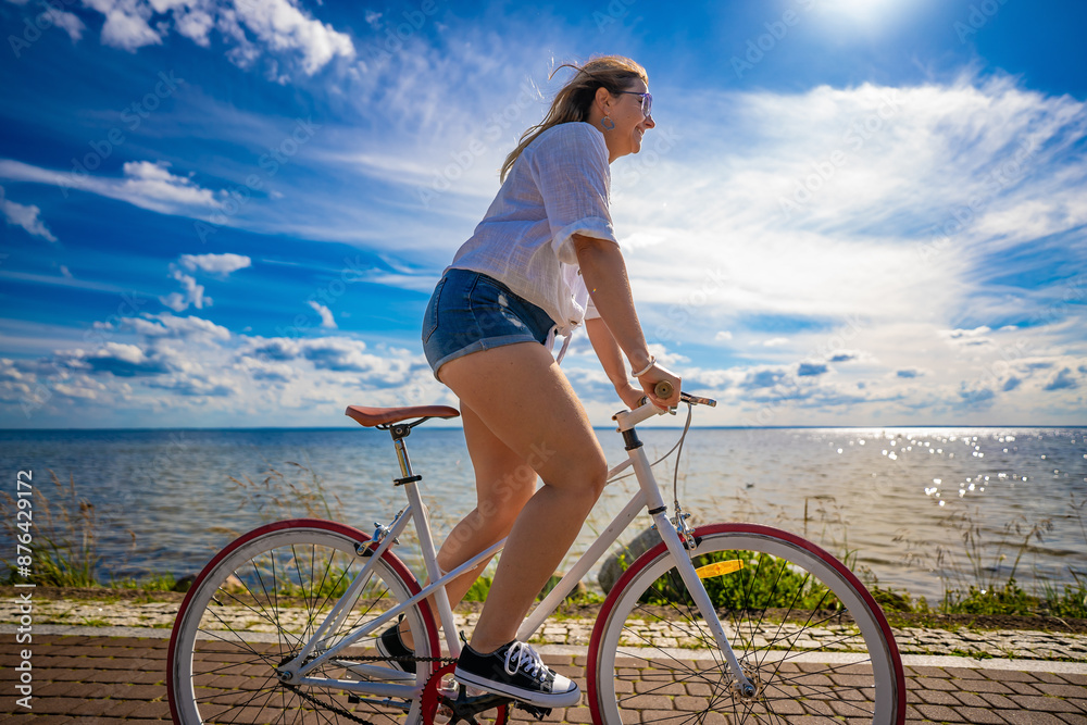 Summer vacation by bike. Young energetic woman with long hair wearing white shirt and denim shorts riding white and red fixed gear bike by sea against background of blue sky with clouds. Side view