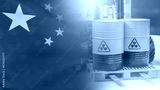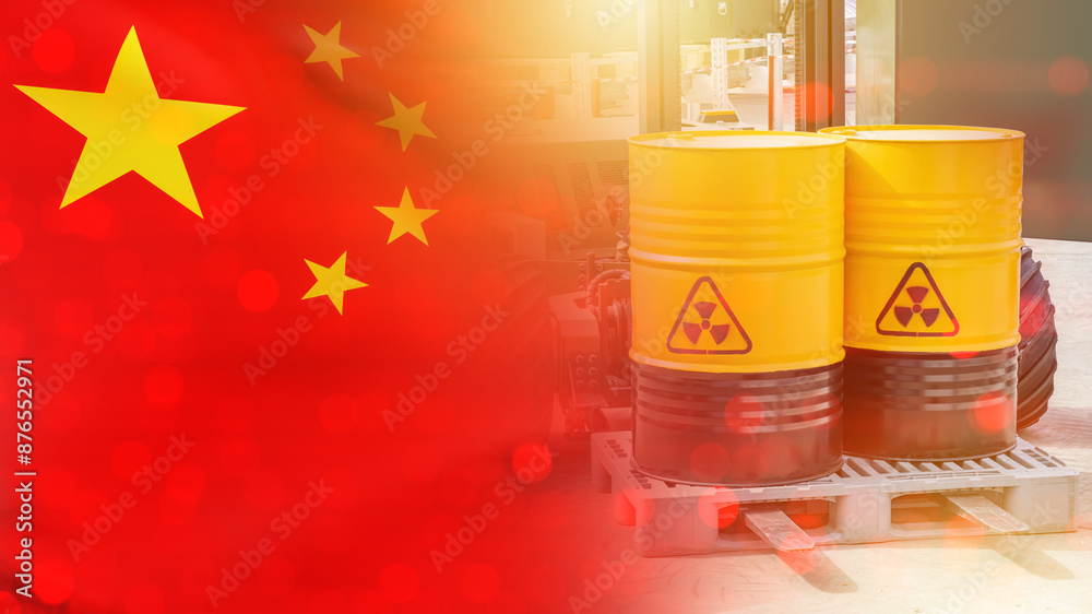Barrels with uranium products. Flag of China. Hazardous substances for nuclear energy. Barrels of uranium are supplied to China. Transportation of radioactive waste. Uranium supplies to China.