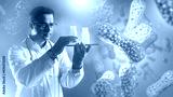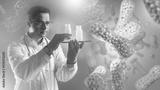 Man doctor with probiotics. Biologist with yogurt in bottles. Doctor studies molecules of probiotics. Products with lactobacilli in hands of man. Microbiologist develops probiotic supplements