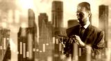 Man economist. Businessman with tablet computer. Investor near financial charts. Economist at work. Business man stands near downtown. Economist analyzes stock market. Man trader concentrated