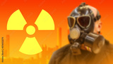 Radiation hazard. Man in gas mask. Logo of radioactive threat. Nuclear fuel leak concept. Radiation hazard sign. Guy wearing gas mask to protect against radiation leakage. Trefoil, fan. Art focus