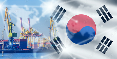 Sea cargo port. South Korea flag. Harbor for unloading ships. Commercial port in south Korea. Equipment for loading sea vessels. Nautical import goods to south Korea. Port in summer weather