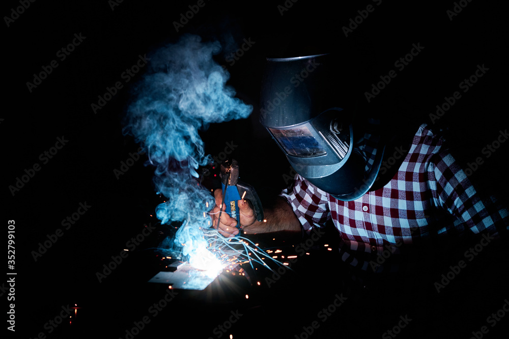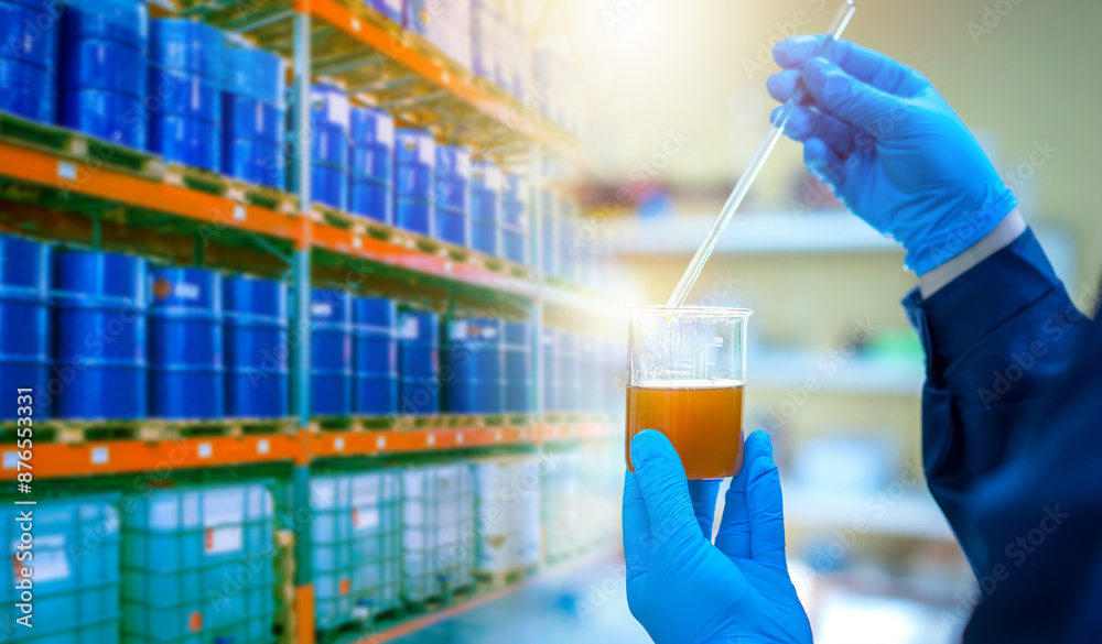 Quality test for fuel. Test tube with pipette in hands of laboratory assistant. Warehouse racks with oil. Fuel is stored in blue barrels. Petroleum quality analysis. Checking composition of gasoline.
