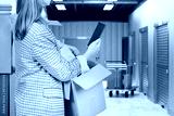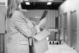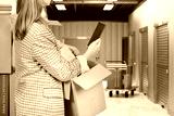 Woman near storage rooms. Lady brought boxes to storehouse. Corridors with closed storage rooms. Cropped woman checks goods delivered to warehouse. Auction of abandoned storage containers concept