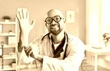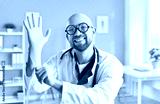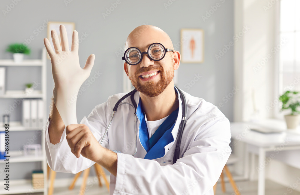 Portrait of a happy and funny male doctor or nurse putting on gloves in a hospital office. Cheerful medical staff member in the medical environment, providing quality and positive healthcare.