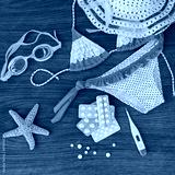 Summer beach accessories and medicine on the table. The concept of medication required in the journey