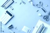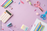 School stationery items including markers, scissors, calculator, pencils, and paper clips arranged on a pastel background