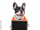 Sweet puppy and board for congratulatory inscription. Closeup, studio shot, indoors. Day light. Congratulations for family, loved ones, relatives, friends, colleagues. Pets care concept