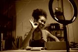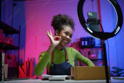 Young entrepreneur smiles and gives the ok sign while recording a video in her office and unpacking a box for her followers