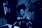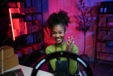 Young lady creates a video blog with a ring light, seated at her desk in a room filled with packages waiting to be sent out