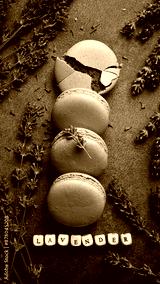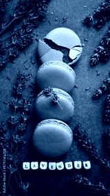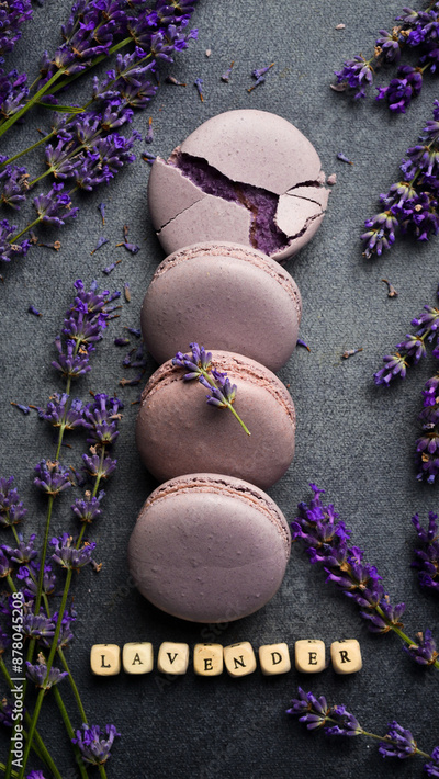Lavender macaroons. A bunch of lavender and sweet pastries. Top view.