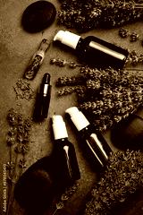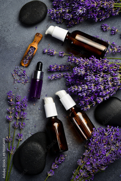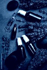 A bottle of essential oil with fresh blooming lavender twigs. Top view. Free space for text.