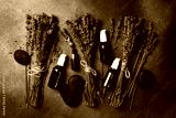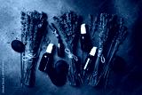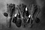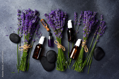 Glass bottle of lavender essential oil with fresh lavender flowers. Spa procedures and aromatherapy. Top view. Free space for text.