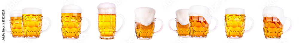 Set of fresh beer glasses with bubble froth isolated on white background.