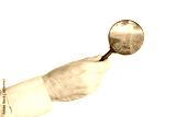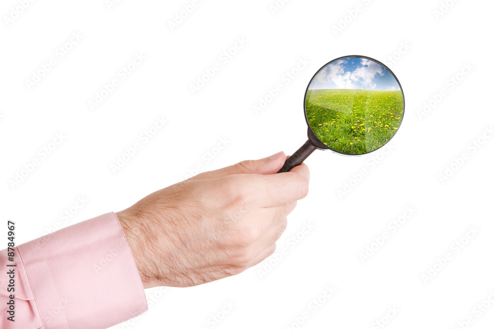 hand of man with loupe isolated on white background and summer landscape( from my image)