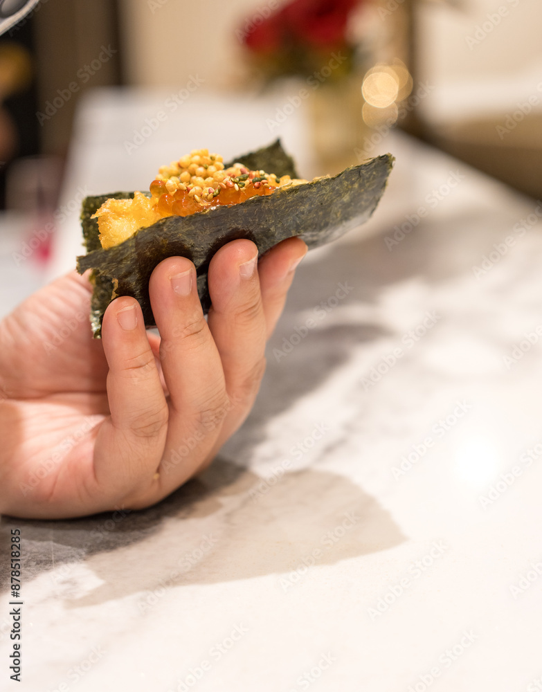 Omakase of sushi hand roll with shrimp tempura in hand. Close up