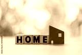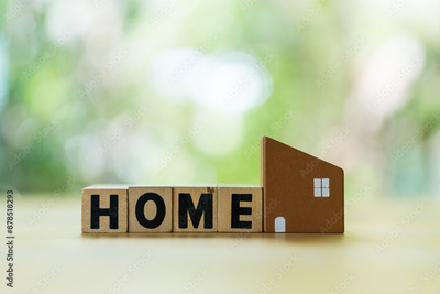 Model of home with text of HOME against natural background with copy space. A mortgage loan. Suitable. Real estate market