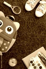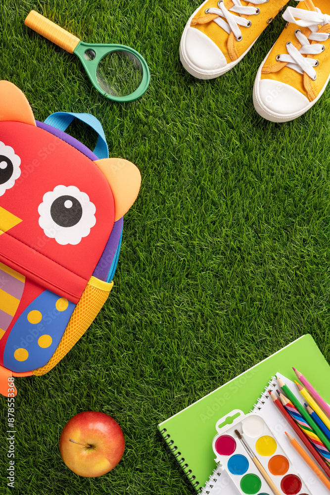 Colorful back to school supplies including a backpack, sneakers, and various stationery items on vertical green grass