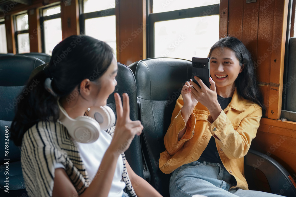 Two young asian women happily taking photos on their phone during a relaxing train ride, capturing memories and sharing moments of togetherness
