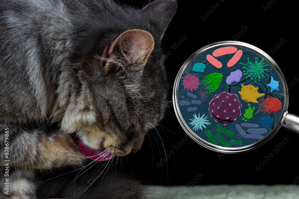 Pet allergy. Magnifying lens with simulated allergen, germs, viruses; bacteria, helminth eggs, coli. The cat licks his paw
