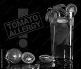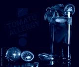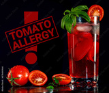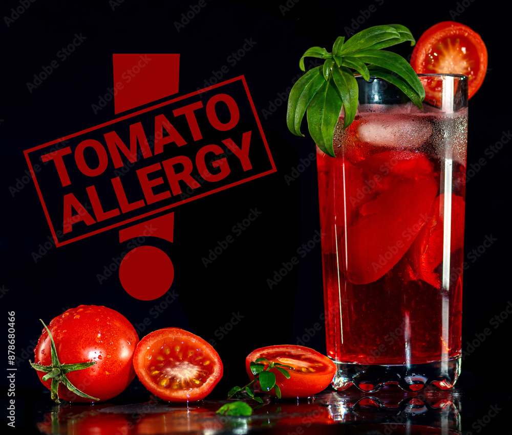 Tomato intolerance, ripe tomato fruits, allergen food allergy. Cocktail Red drink with virgin tomato juice. Fresh prepared alcoholic cooler beverage on an isolated black background