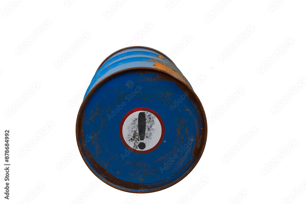 Blue barrel with biohazard warning exclamation mark, toxic waste. The symbol indicates that hazardous products death or poisoning. Rusty dangerous barrel with on isolated background