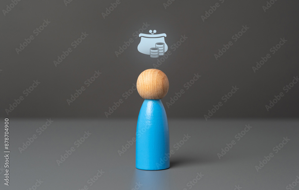 A figurine of a man with a savings wallet icon above his head. Wealth and prosperity. Savings and capital. Purchasing power. Investments. Financial literacy