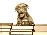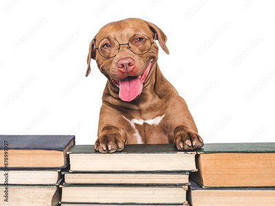 Cute dog and old books. Close-up, indoors, studio shot. Isolated background. Concept of care, education, obedience training and raising of pets