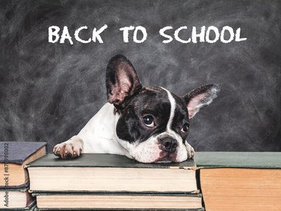 Back to school. Cute puppy and blackboard with inscription. Close-up, isolated background. Studio shot, day light. Concept of care, education, obedience training and raising of pet