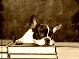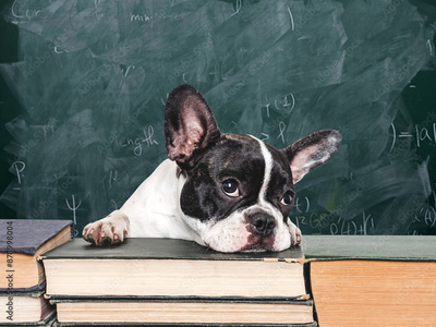 Cute puppy and old books. Close-up, indoors, studio shot. Isolated background. Concept of care, education, obedience training and raising of pets