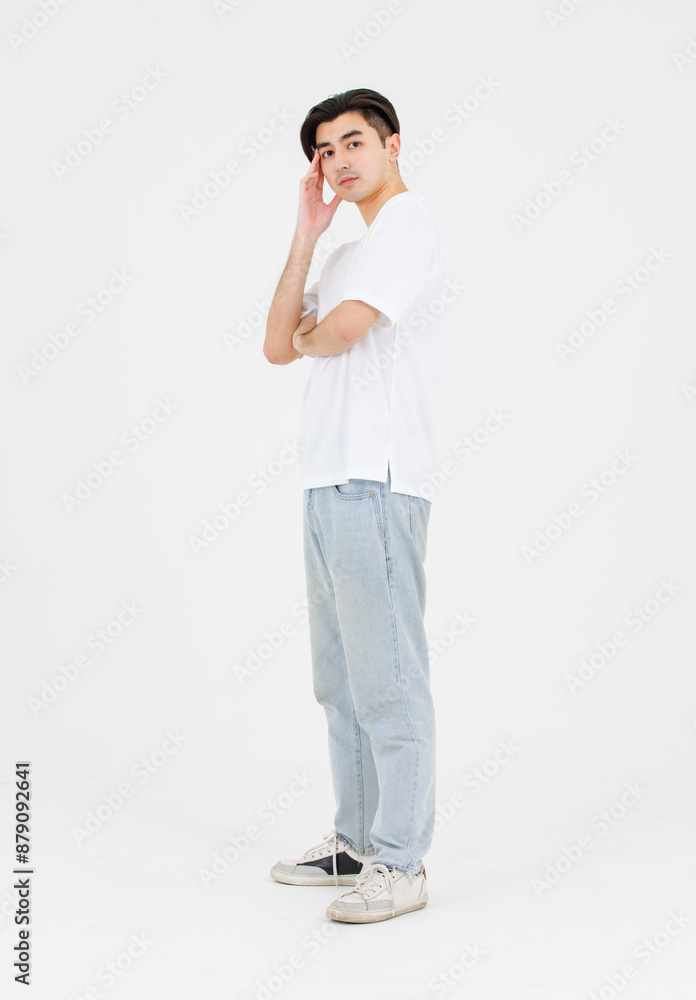 Portrait of asian male confidence charming successful handsome young guy , Wearing white t-shirt and jeans posing relaxed looking attractive standing on white background in studio - isolated