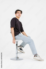 Portrait of asian male confidence charming successful handsome young guy , Wearing black t-shirt and jeans posing relaxed looking attractive sitting on chair in white background studio - isolated