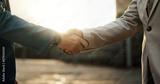 Closeup, handshake and business people in city, agreement and partnership with welcome, introduction and collaboration. New York, men and employees shaking hands for offer, promotion and cooperation