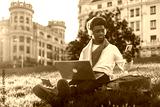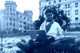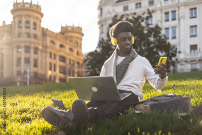 African american student using laptop in college campus while listening to music. College lifestyle.