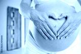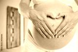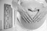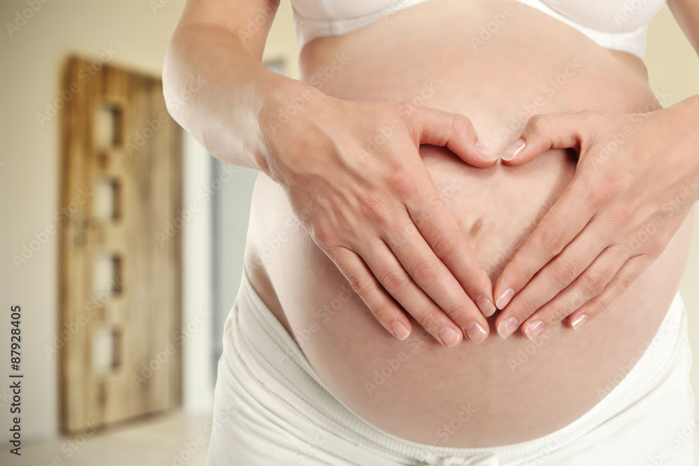 A pregnant woman showing her round belly and making a heart out of her hands.
