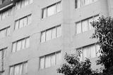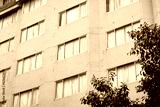 Pink building with many windows and a tree in front. The building is old and has a lot of damage