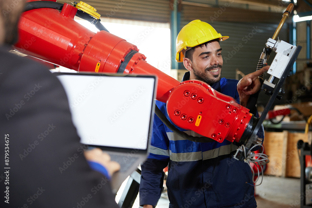 factory worker or engineer checking machine and boss using laptop computer for being observed in robot factory