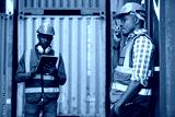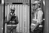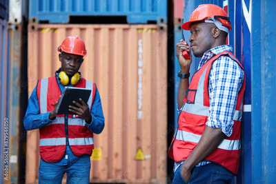 African factory worker or engineer using walkie talkie and talking about work in containers warehouse storage