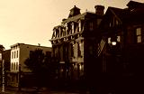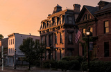 beautiful historic brick buildings in downtown hudson new york at sunset (golden hour glow at dusk night sun set) warren street valley upstate (brownstone homes, business district main)