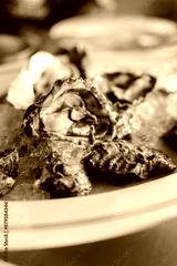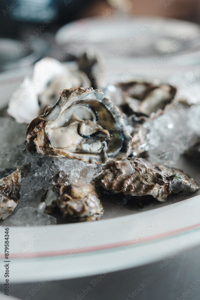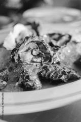 Fresh Oysters on ice. Healthy sea food. Oyster dinner in a restaurant