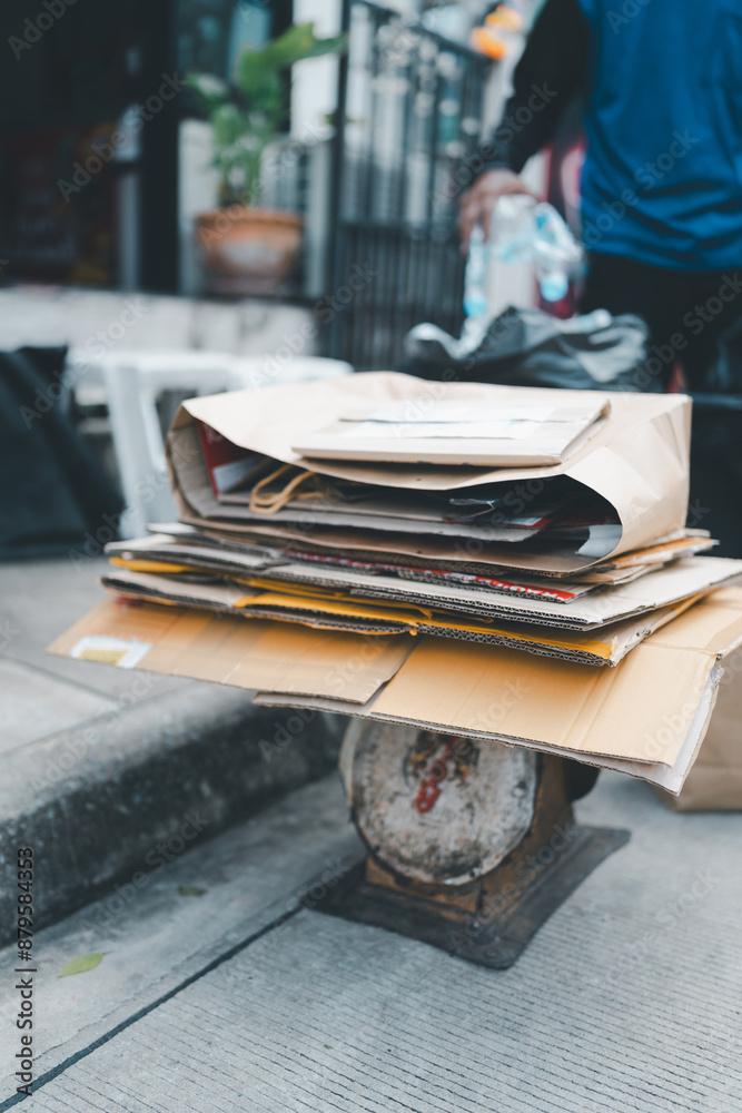 Pile of used box cardboard papers placed on scales for sale to the vendor, buy unused item